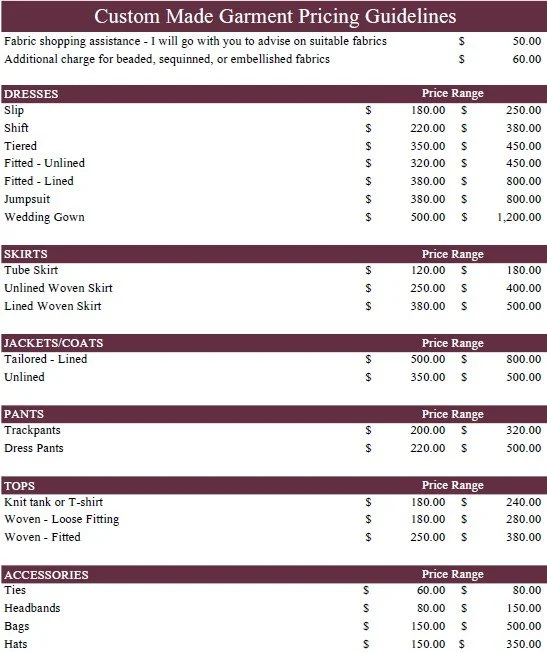 All custom garment prices include: patternmaking, fabric cutting, sewing, fitting, mockup materials, standard zips/buttons/elastic, thread.